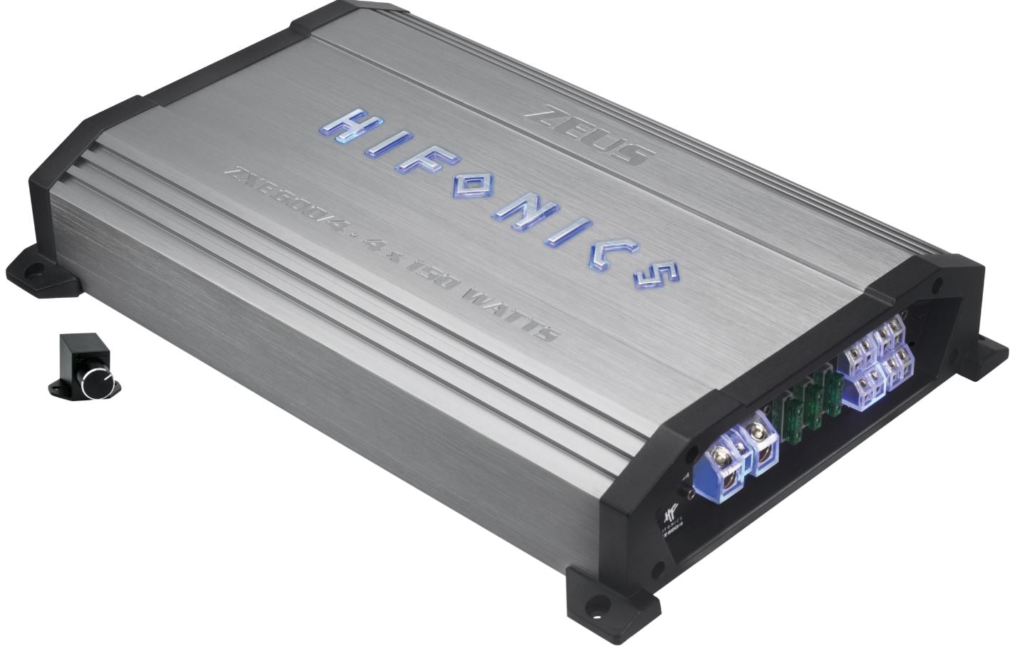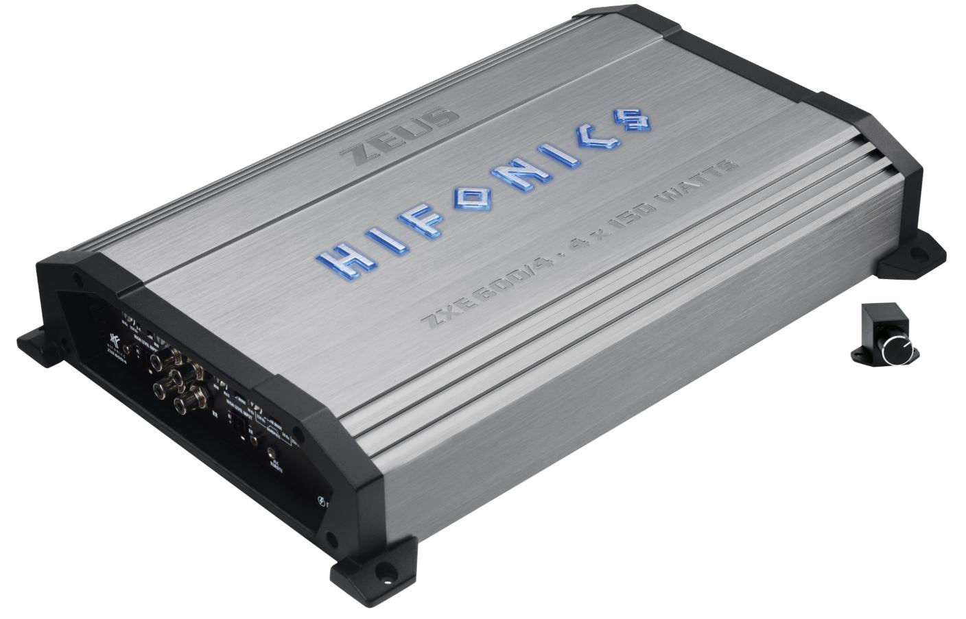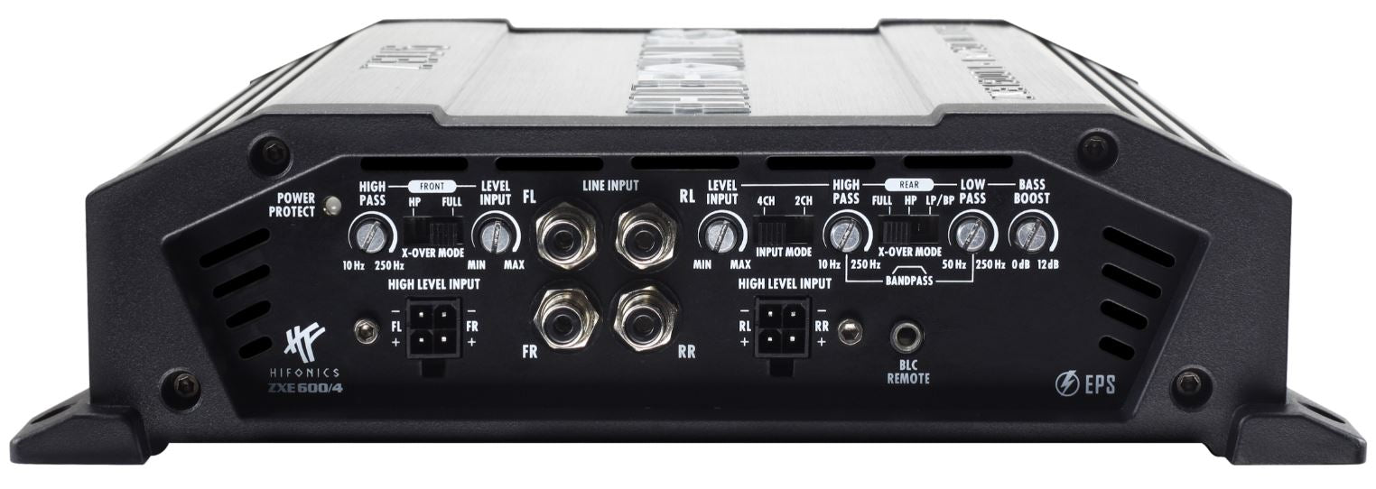 Die neuen HiFonics ZEUS EVOLUTION ZXE Verstärker besitzen schon ab Werk hochfunktionale Features wie Hochpegel-Eingänge mit EPS, Einschaltautomatik, Start-Stopp-Fähigkeit, voll regelbare Weichen, Bandpass-Funktion, Bass-Pegelfernbedienung und sind damit perfekt für den multiplen Einsatz in modernen Car Hifi Systemen gewappnet. Bei der Auswahl der Komponenten im Innern wurde ebenfalls nicht gespart: So kommen aufwendige und teure NE5532 Operationsverstärker zum Einsatz, die normalerweise nur in viel teureren Modellen zu finden sind. Das Resultat verblüfft nicht nur durch hohe Leistung, sondern auch durch unglaublich feinen Klang. Der gebürstete, in grau gehaltene Alu-Kühlkörper ist schon eine Augenweide an sich. Die schwarzen Endcaps aus Aluminium-Guss unterstreichen zusätzlich die Wertigkeit der ZEUS EVOLUTION ZXE Serie. Optisches Highlight ist das beleuchtete HiFonics-Logo, das sich von blau auf weiß umschalten lässt. Aber nicht nur das Logo ist beleuchtet, auch die Strom- und Lautsprecheranschlüsse strahlen in HiFonics blau und sorgen für ein weiteres optisches Highlight.