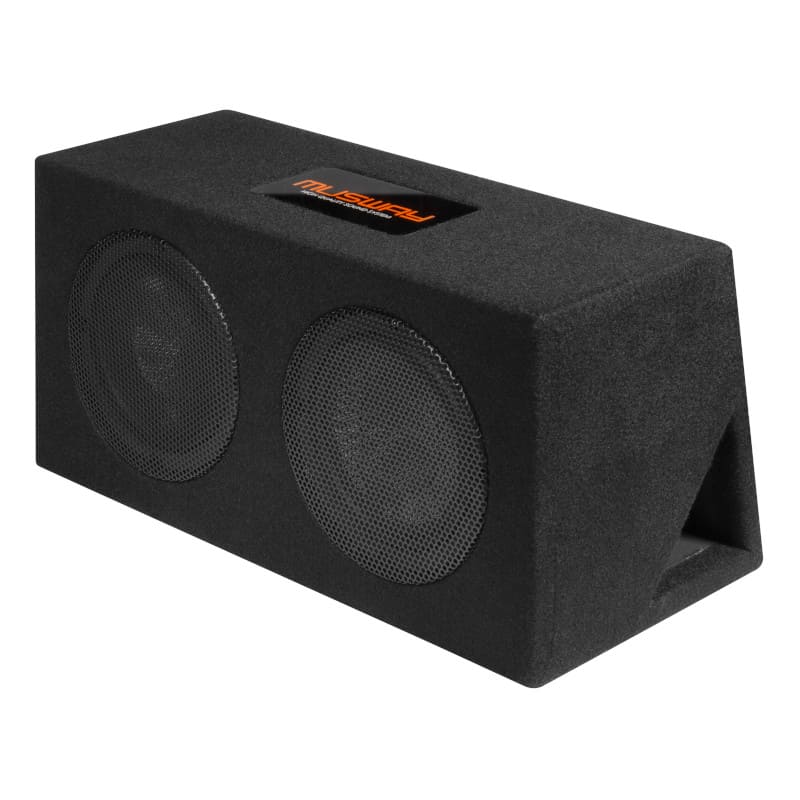Die stabil konstruierten MDF-Gehäuse sind mit hochwertigem schwarzem Teppich bezogen und fügen sich harmonisch und dezent in jedes Fahrzeuginterieur ein. Weiterhin sind ohne Ausnahme alle Modelle mit Quick Connect Anschlussbuchsen ausgestattet und können blitzschnell per optionalem Anschlusskabel beispielsweise an die MUSWAY M6 und deren Quick Connect Terminal angeschlossen werden. Selbstverständlich können die MUSWAY Subwoofer-Systeme auch konventionell an herkömmliche Push-Pin Terminals angeschlossen werden.