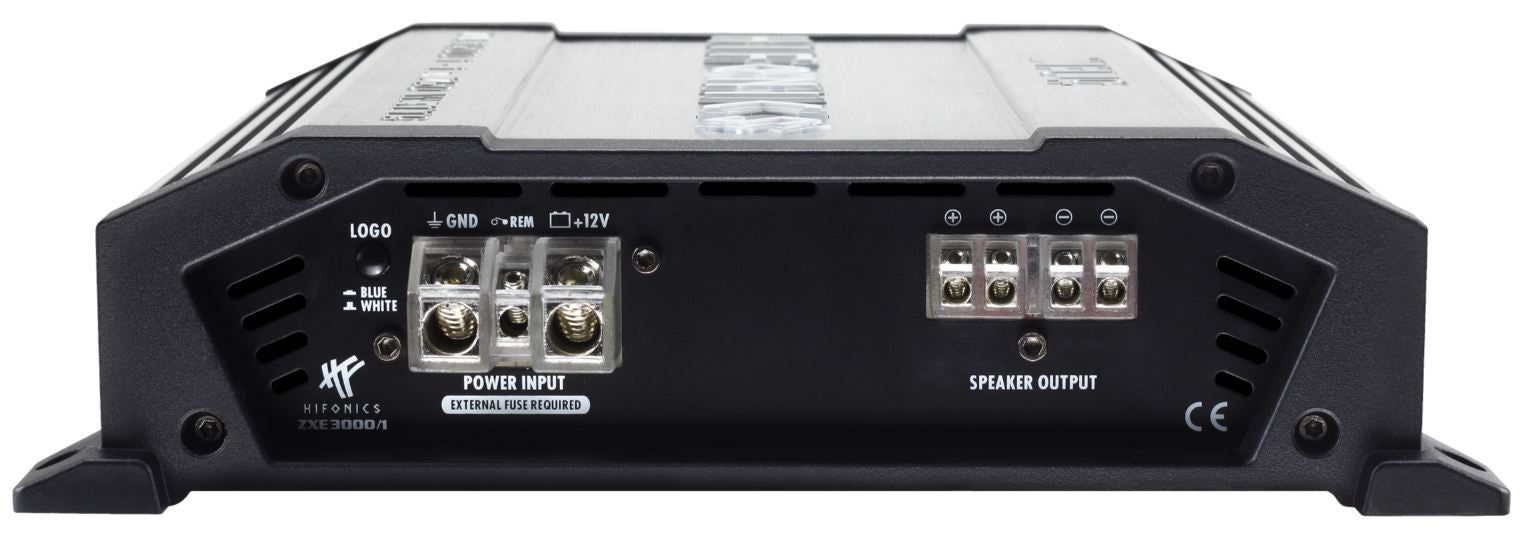 The new HiFonics ZEUS EVOLUTION ZXE amplifiers already have highly functional features such as high-level inputs with EPS, automatic switch-on, start/stop capability, phase shift, subsonic filter, bass boost, bass level remote control and are therefore perfectly equipped for use in modern car hi-fi systems. Three digital mono amplifiers extend the multi-channel program for subwoofer applications. The master/slave function is another equipment highlight on board. If the power of one amplifier is not sufficient, a second, identical ZEUS ZXE amplifier can be used and connected via an RCA cable. Now the first amplifier acts as a controller and takes over the control of the second amplifier. The highlight here is that the output is doubled. The brushed, gray aluminum heat sink is a feast for the eyes in itself. The black cast aluminum end caps further underline the quality of the ZEUS EVOLUTION ZXE series. The illuminated HiFonics logo, which can be switched from blue to white, is a visual highlight. But not only the logo is illuminated, the power and speaker connections also shine in HiFonics blue and provide a further visual highlight.