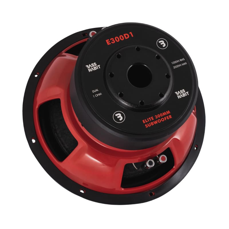This is the Bass Habit Elite E300D1 and D2, a really great 12" subwoofer! With a large magnet and high power handling, it delivers rich bass that works great in both closed and bass reflex enclosures. And doesn't it look cool with its super sturdy red basket? It's super versatile and perfect for any kind of music and the best part? It's a real bargain!