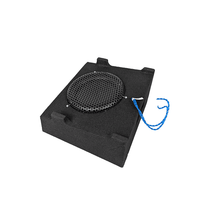 Un subwoofer ArcAudio ARC8 dans un boîtier spécifique au véhicule pour VW T5 / T6 Transporter et Multivan avec siège individuel côté passager, en multiplex de bouleau de 12 mm parfaitement ajusté.