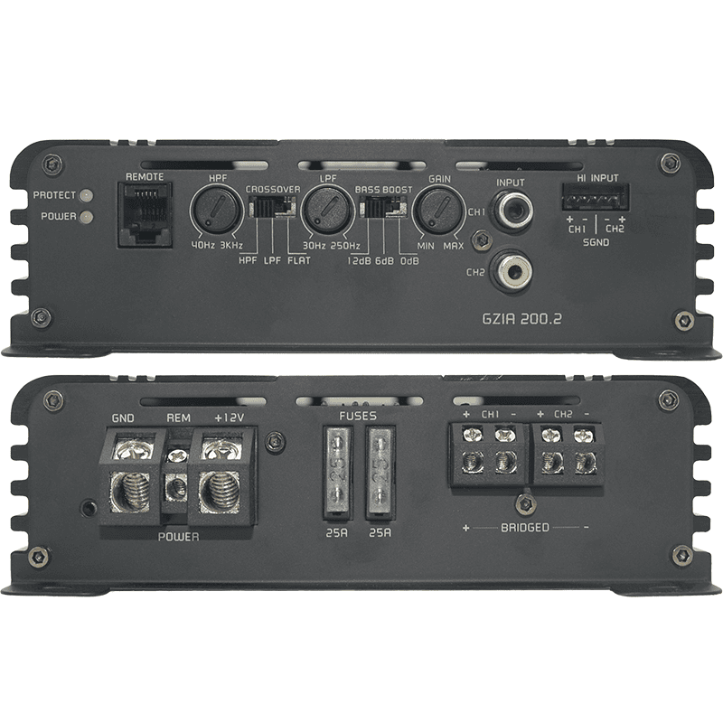 Amplificateur à 2 canaux avec circuit de classe A/B, filtre actif intégré et dissipateur thermique noir anodisé.