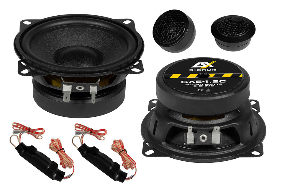 Die SIGNUM SXE Lautsprecher sind die Lösung schlechthin, wenn wenig Platz für den Einbau vorhanden ist. Möglich machen dies die flach aufgebauten, verwindungssteifen Stahlkörbe, die dennoch einen erstaunlichen Hub wie bei weitaus tieferen Lautsprechern liefern. Die sehr leichten und mit speziellem Quarzsand beschichteten Papier-Membranen sorgen für einen hohen Wirkungsgrad, während die 20 mm Gewebe-Neodym-Hochtöner mit kompakten Einbaumaßen einen sehr linearen Frequenzbereich im Zusammenspiel mit den Bässen bei 3 Ω Impedanz wiedergeben. Die ebenfalls sehr kompakten Kabel-Frequenzweichen – jeweils Hochtöner und Bass getrennt (außer bei SXE4.2C) - sind überall leicht zu integrieren.