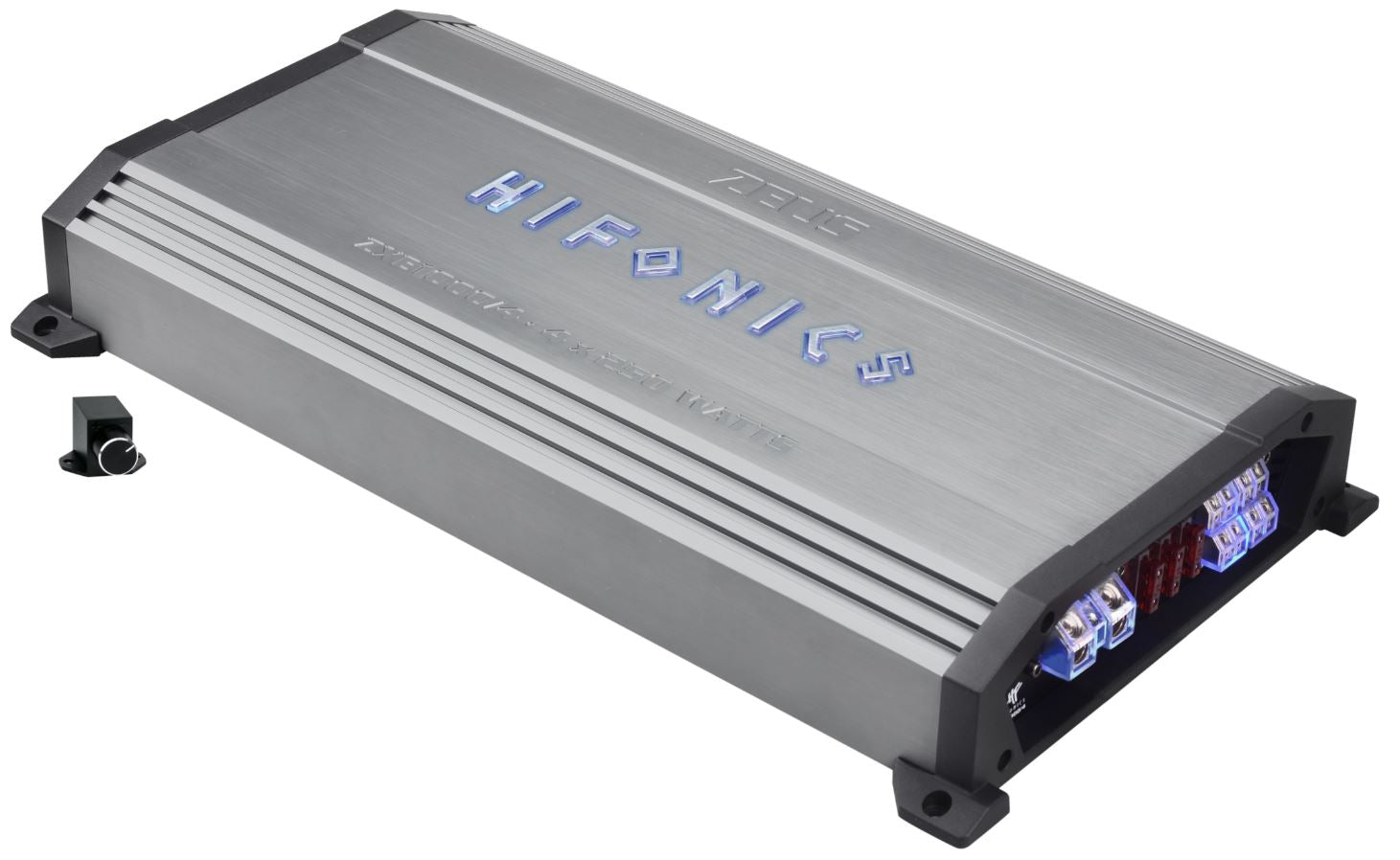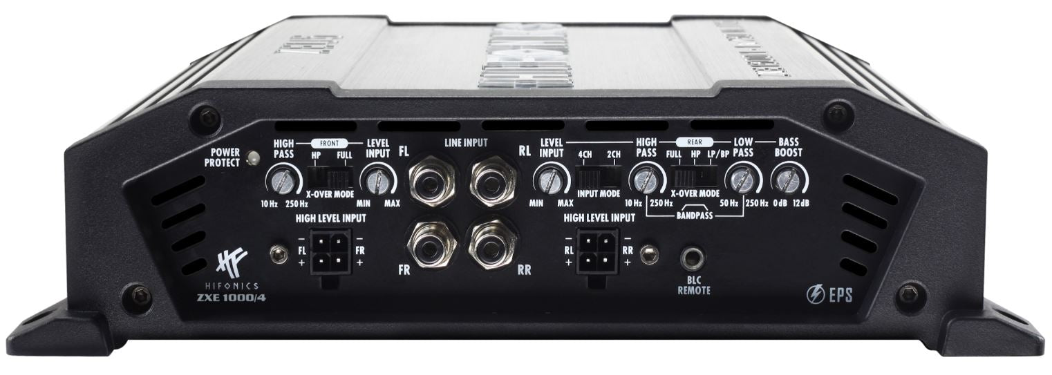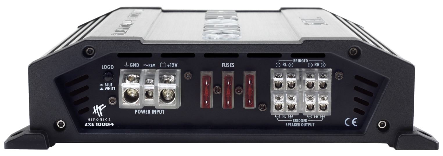 Die neuen HiFonics ZEUS EVOLUTION ZXE Verstärker besitzen schon ab Werk hochfunktionale Features wie Hochpegel-Eingänge mit EPS, Einschaltautomatik, Start-Stopp-Fähigkeit, voll regelbare Weichen, Bandpass-Funktion, Bass-Pegelfernbedienung und sind damit perfekt für den multiplen Einsatz in modernen Car Hifi Systemen gewappnet. Bei der Auswahl der Komponenten im Innern wurde ebenfalls nicht gespart: So kommen aufwendige und teure NE5532 Operationsverstärker zum Einsatz, die normalerweise nur in viel teureren Modellen zu finden sind. Das Resultat verblüfft nicht nur durch hohe Leistung, sondern auch durch unglaublich feinen Klang. Der gebürstete, in grau gehaltene Alu-Kühlkörper ist schon eine Augenweide an sich. Die schwarzen Endcaps aus Aluminium-Guss unterstreichen zusätzlich die Wertigkeit der ZEUS EVOLUTION ZXE Serie. Optisches Highlight ist das beleuchtete HiFonics-Logo, das sich von blau auf weiß umschalten lässt. Aber nicht nur das Logo ist beleuchtet, auch die Strom- und Lautsprecheranschlüsse strahlen in HiFonics blau und sorgen für ein weiteres optisches Highlight.